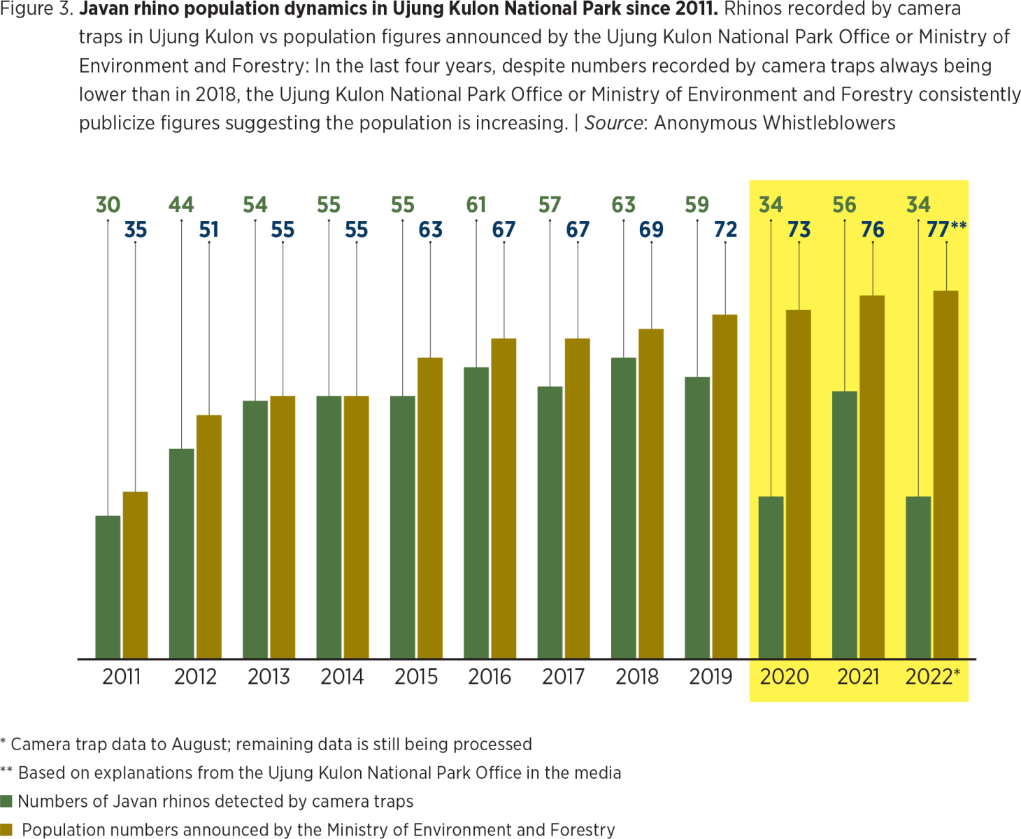 Since 2020, camera traps have only recorded less than 60 Javan rhinos in Ujung Kulon (whereas in 2018, 63 individuals were recorded). Although camera trap findings has decreased, the Ujung Kulon National Park Agency or the Ministry of Environment and Forestry announced that the population is always increasing. Likewise, for the absence of 18 rhino individuals since 2019, not a shred of information about this matter was announced to the public.