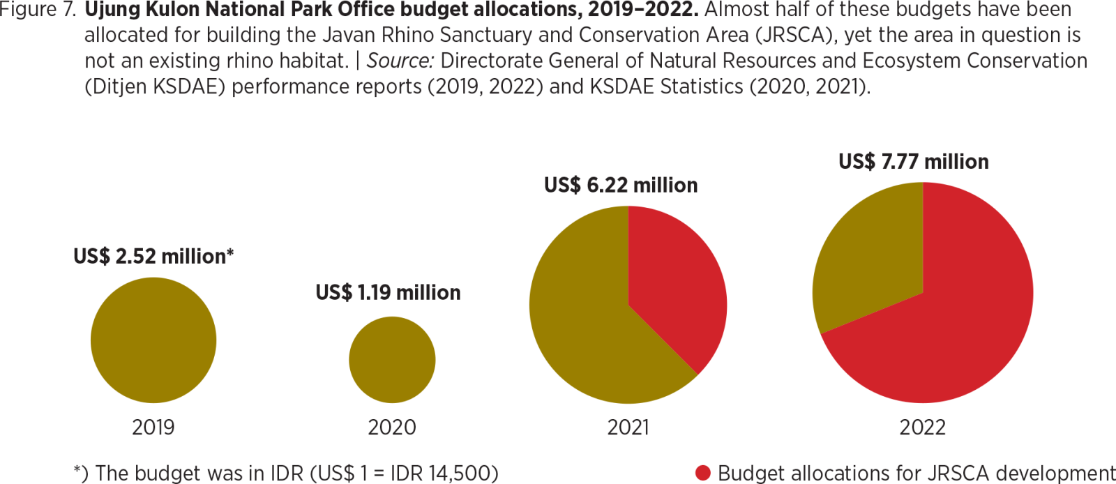 The budget allocation of Ujung Kulon National Park has not been prioritized for technical needs of rhino conservation currently. Meanwhile, the structure and placement of employees do not reflect the prioritization of technical rhino conservation activities. In recent years, the Ujung Kulon National Park Agency has spent their resources and energy on the construction of the Javan Rhino Study and Conservation Area (JRSCA), even though this area is outside the existing habitat of the Javan rhinoceros and is not needed for a second habitat or second population program.
