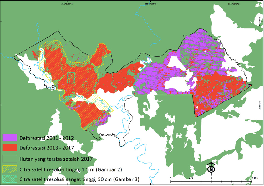 Peta kehilangan tutupan tegakan (tree cover loss) oleh Hansen et al. 2013. “High-Resolution Global Maps of 21st-Century Forest Cover Change.” Science 342 (15 November): 850–53; dengan update hingga tahun 2017.